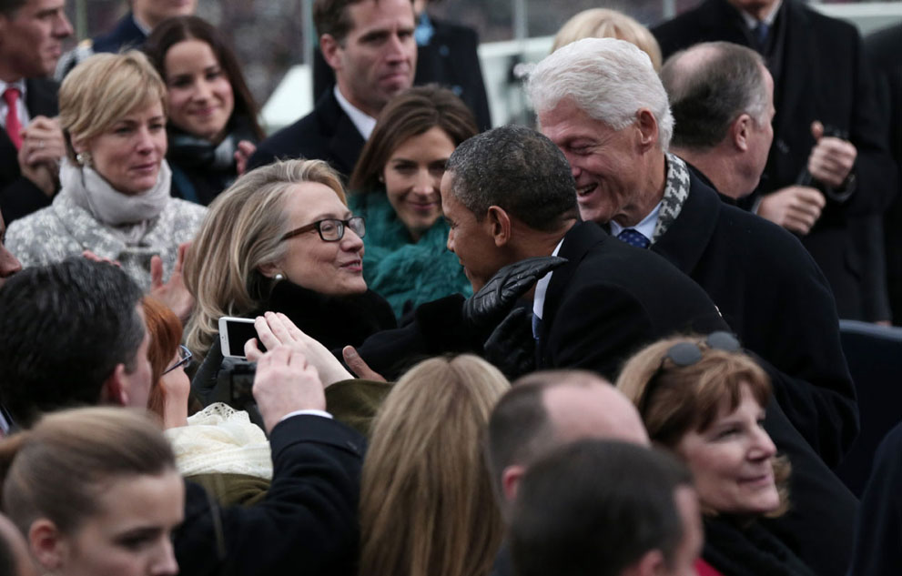 3.President Barack Obama greets Secretary of State Hillary Clinton and former president Bill Clinton on the West Front of the U.S. Capitol, on January 21, 2013. (Win McNamee/Getty Images)