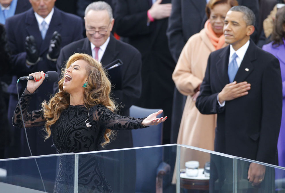 4.Performer Beyonce sings the U.S. National Anthem as President Barack Obama and Senator Charles Schumer listen during swearing-in ceremonies on the West front of the U.S. Capitol, on January 21, 2013.