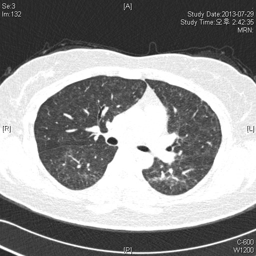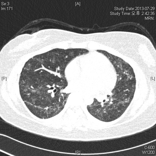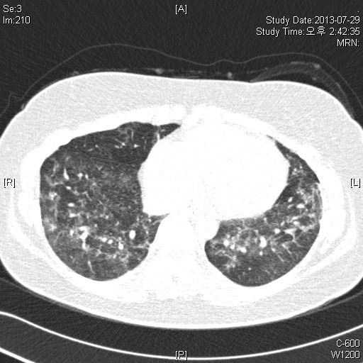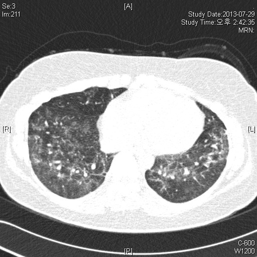 PFT: FVC/FEV1/Ratio: 2140(56%)/ 1810(60%)/ 84% (3ÃÊ ÀÌ»ó ºÒÁö ¸øÇÔ)