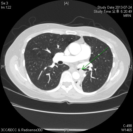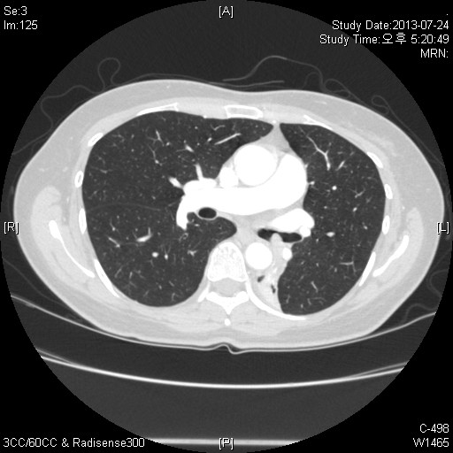 Chest PA»ó ½ÉÀå°ú Áß÷µÇ¾î »ï°¢Çü ¸ð¾çÀÇ À½¿µÀÌ º¸ÀÔ´Ï´Ù. ÁÂÃø Æó¹®ÀÌ Á» ³·¾ÆÁö°í ÁÂÇÏ¿± Æóµ¿¸ÆÀÌ Àß º¸ÀÌÁö ¾Ê´Â °æ¿ì°¡ ¸¹½À´Ï´Ù. lateral¿¡¼´Â major fissure°¡ ÈĹæÀ¸·Î À̵¿ÇÒ ¶§ ÀǽÉÇÒ ¼ö ÀÖ°Ú½À´Ï´Ù.